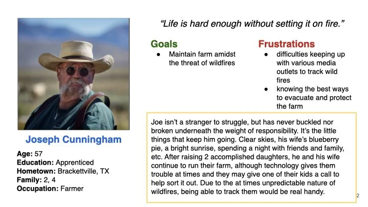 [Joe] is a [small family farm owner] who needs [a way to keep track of wildfires near him] because [wildfires area a problem in his area and it can be dangerous to return before the all clear].