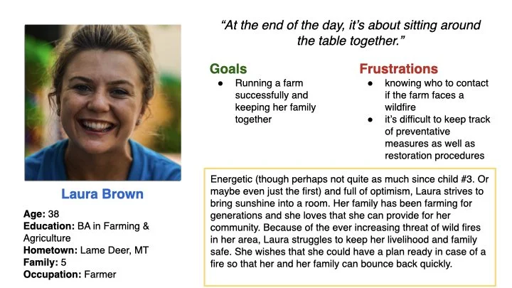 [Laura] is a [mother of three and family farm business owner] who needs [a way to keep track of wildfires in her area and strategies to rebuild the farm after a fire] because [wildfires are a danger to people and livestock and it can be difficult to know how to rebuild].